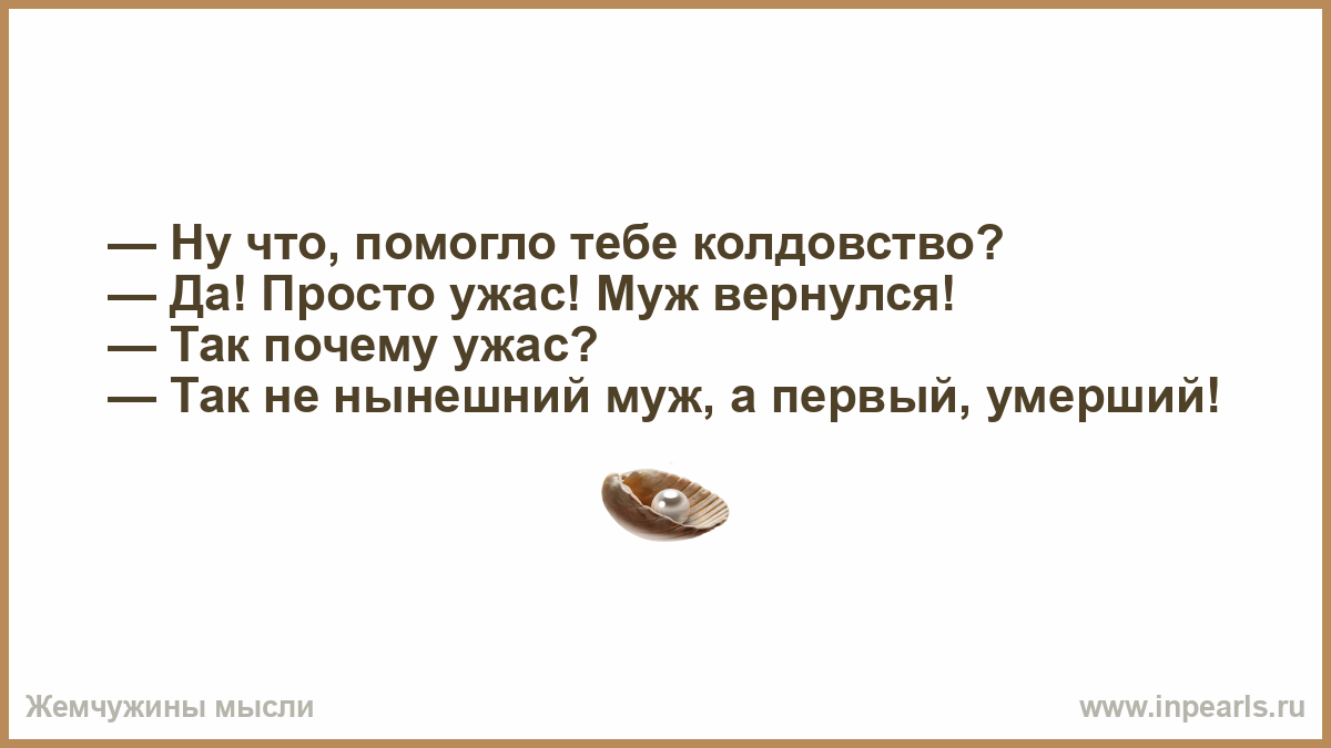 — Ну что, помогло тебе колдовство? — Да! Просто ужас! Муж вернулся! — Так почему ужас? — Так не нынешний муж, а первый, умерший!