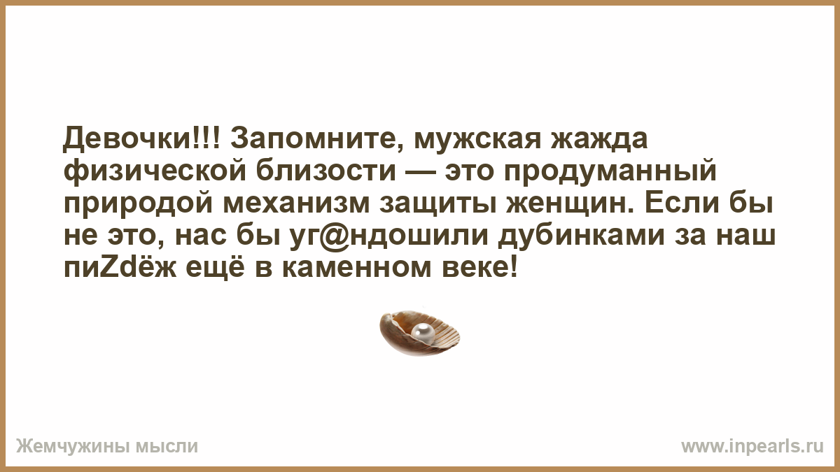 Девочки!!! Запомните, мужская жажда физической близости — это продуманный природой механизм защиты женщин. Если бы не это, нас бы уг@ндошили дубинками за наш пиZdёж ещё в каменном веке!