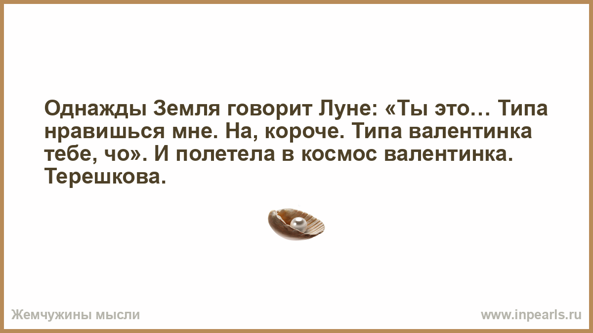 Однажды Земля говорит Луне: «Ты это… Типа нравишься мне. На, короче. Типа валентинка тебе, чо». И полетела в космос валентинка. Терешкова.