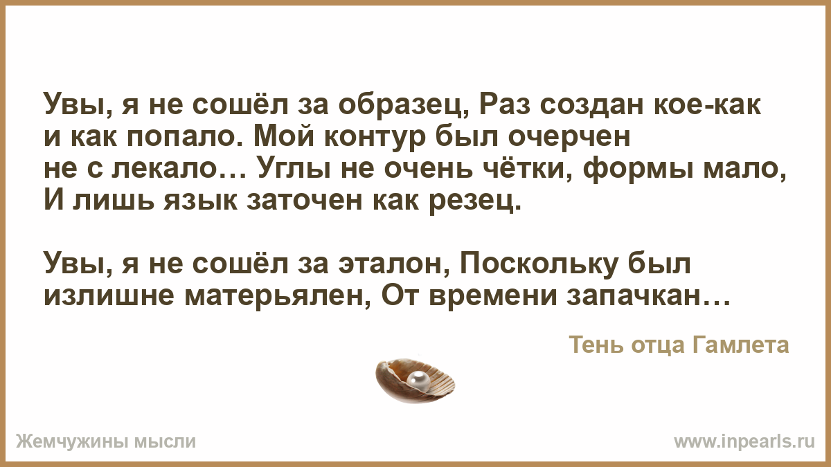 Увы, я не сошёл за образец, Раз создан кое-как и как попало. Мой контур был очерчен не с лекало… Углы не очень чётки, формы мало, И лишь язык заточен как резец.