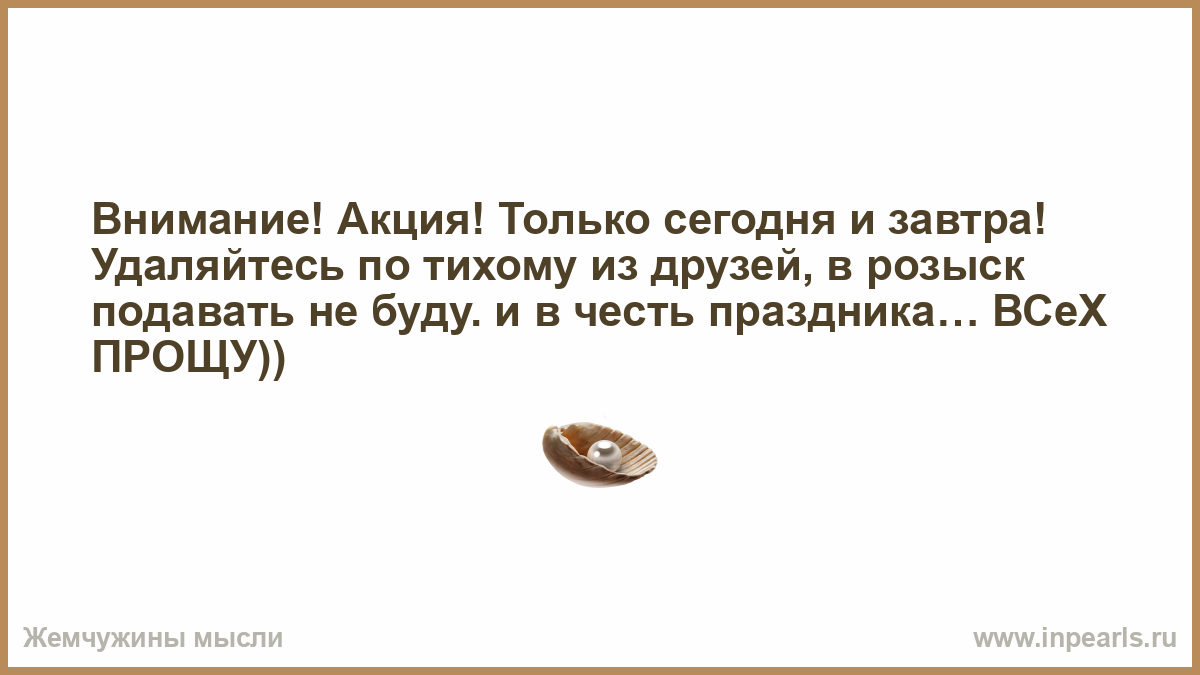 Внимание! Акция! Только сегодня и завтра! Удаляйтесь по тихому из друзей, в розыск подавать не буду. и в честь праздника… ВСеХ ПРОЩУ))
