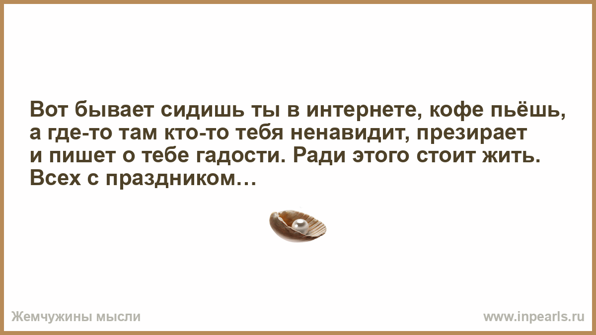 Вот бывает сидишь ты в интернете, кофе пьёшь, а где-то там кто-то тебя ненавидит, презирает и пишет о тебе гадости. Ради этого стоит жить. Всех с праздником…