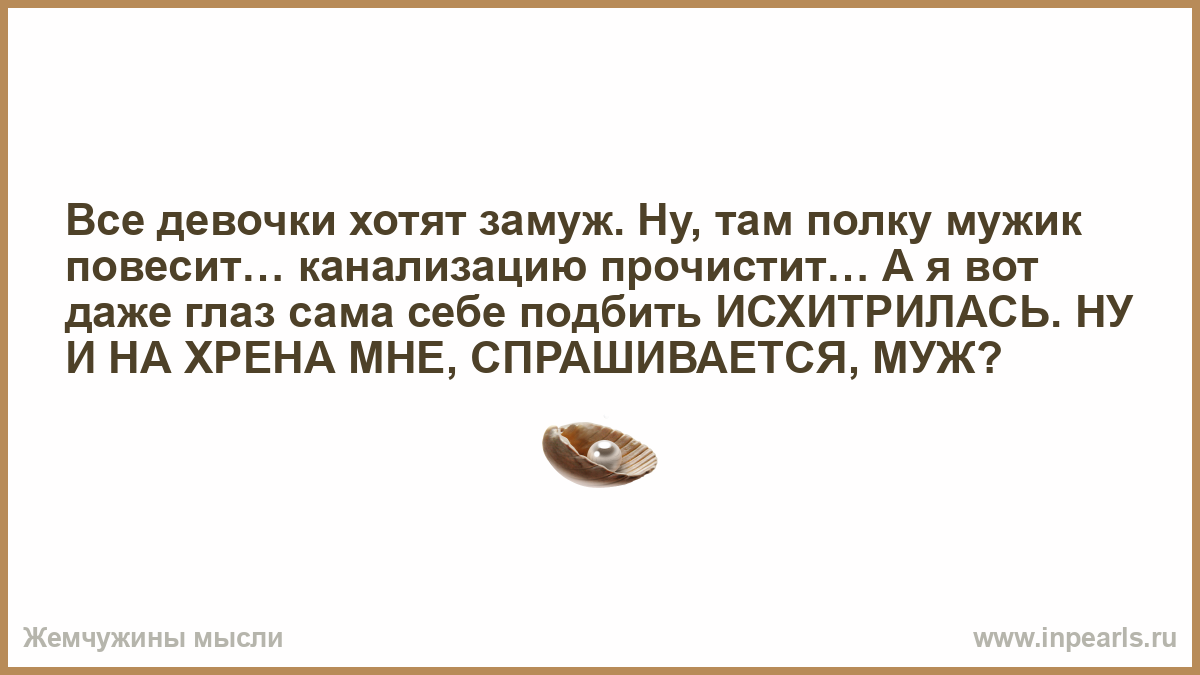 Все девочки хотят замуж. Ну, там полку мужик повесит… канализацию прочистит… А я вот даже глаз сама себе подбить ИСХИТРИЛАСЬ. НУ И НА ХРЕНА МНЕ, СПРАШИВАЕТСЯ, МУЖ?