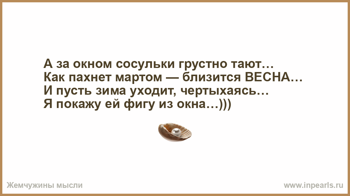 А за окном сосульки грустно тают… Как пахнет мартом — близится ВЕСНА… И пусть зима уходит, чертыхаясь… Я покажу ей фигу из окна…)))
