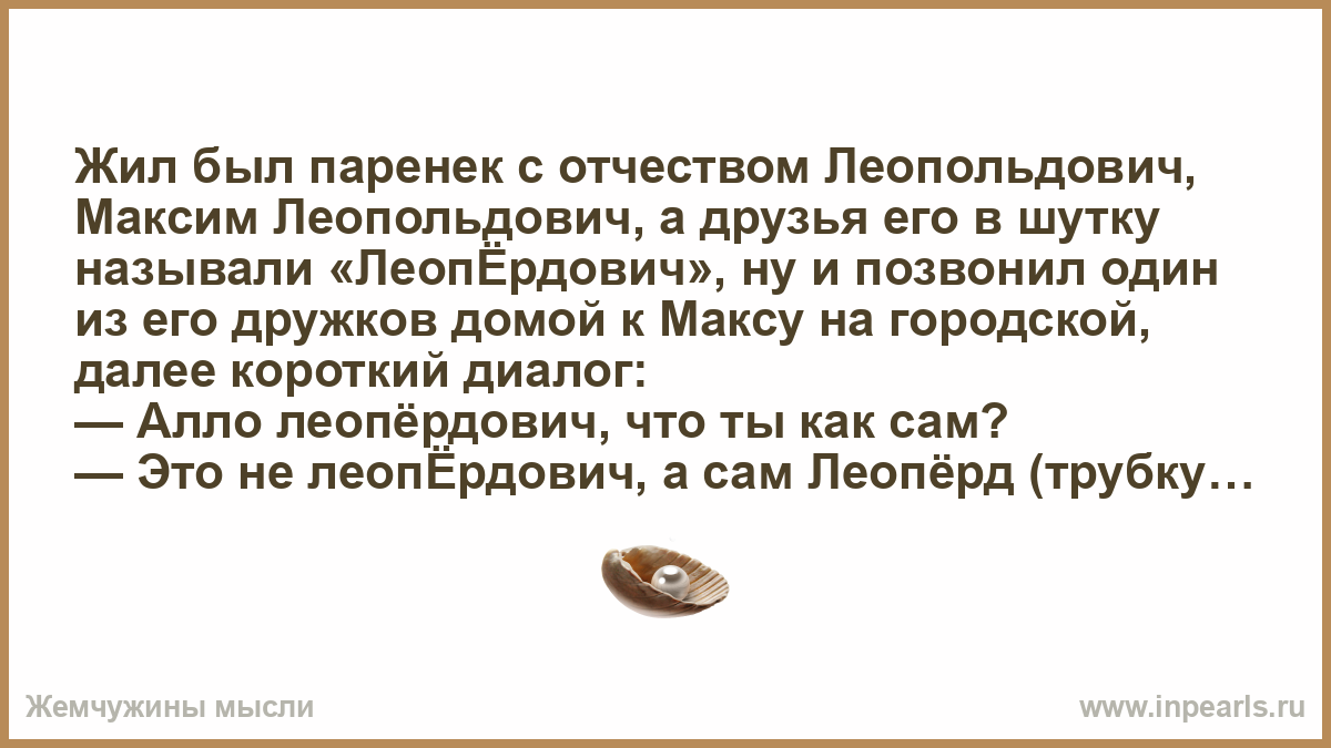 Жил был паренек с отчеством Леопольдович, Максим Леопольдович, а друзья его в шутку называли «ЛеопЁрдович», ну и позвонил один из его дружков домой к Максу на городской, далее короткий диалог: