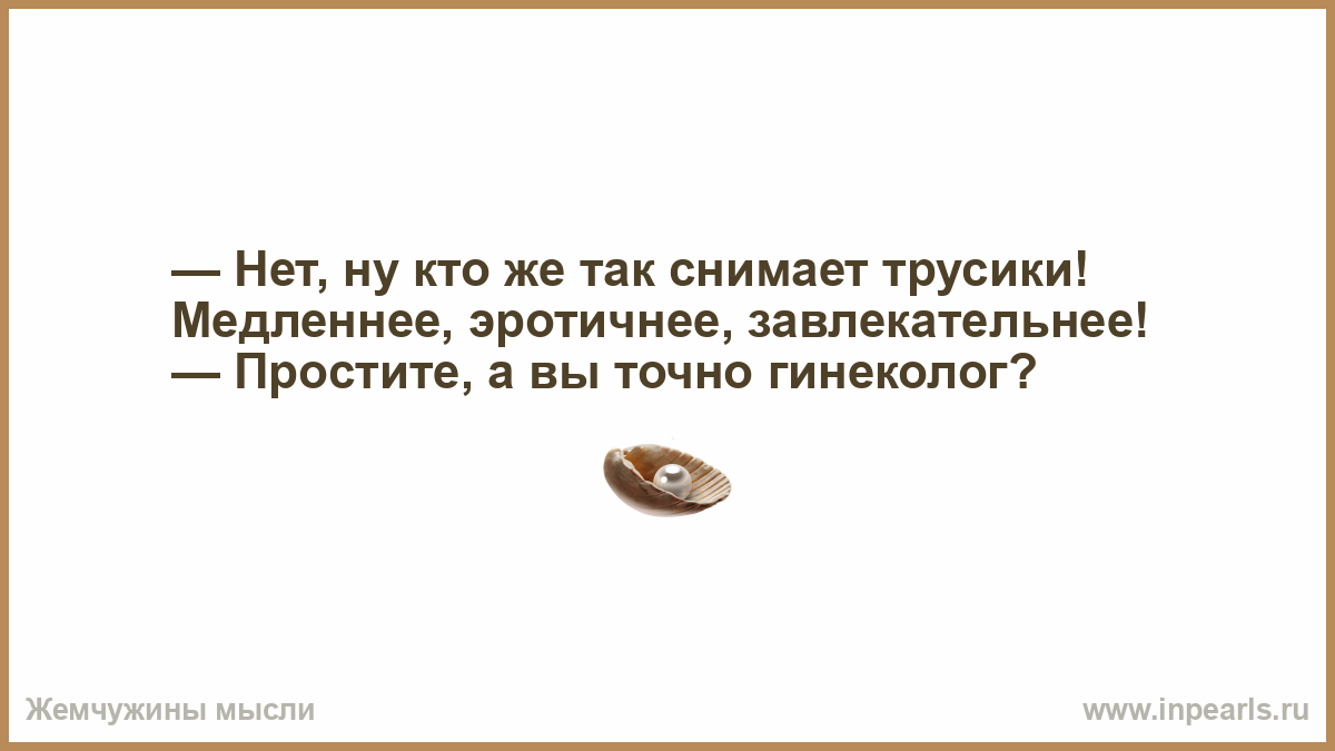 — Нет, ну кто же так снимает трусики! Медленнее, эротичнее, завлекательнее! — Простите, а вы точно гинеколог?