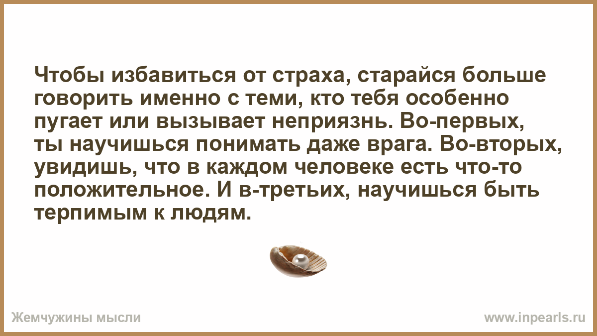 Чтобы избавиться от страха, старайся больше говорить именно с теми, кто тебя особенно пугает или вызывает неприязнь. Во-первых, ты научишься понимать даже врага. Во-вторых, увидишь, что в каждом человеке есть что-то положительное. И в-третьих, научишься быть терпимым к людям.