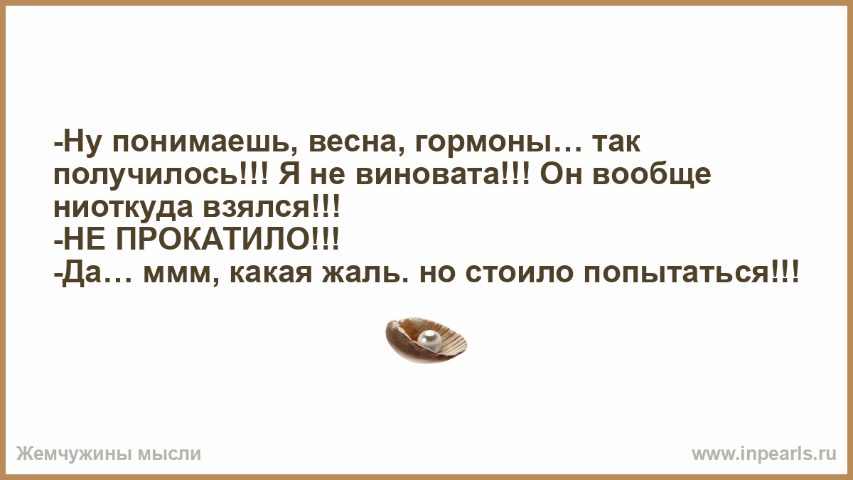 -Ну понимаешь, весна, гормоны… так получилось!!! Я не виновата!!! Он вообще ниоткуда взялся!!!