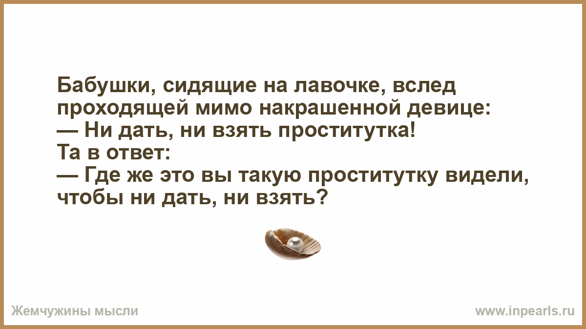 — Где же это вы такую проститутку видели, чтобы ни дать, ни взять?