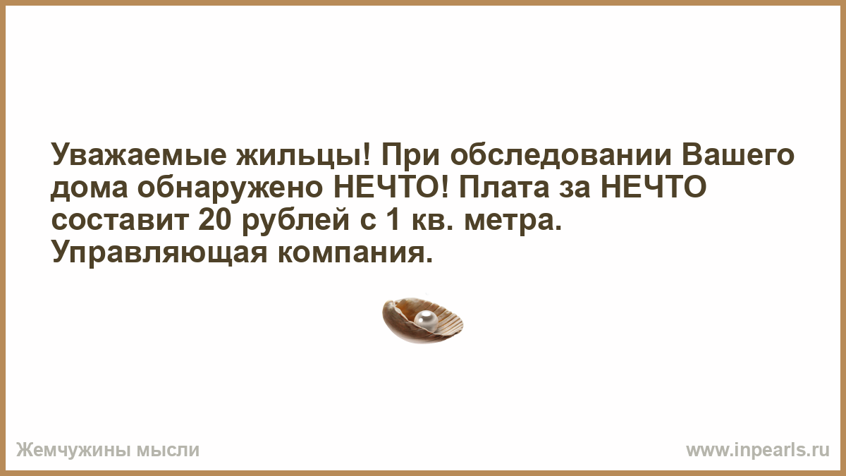 Уважаемые жильцы! При обследовании Вашего дома обнаружено НЕЧТО! Плата за НЕЧТО составит 20 рублей с 1 кв. метра. Управляющая компания.