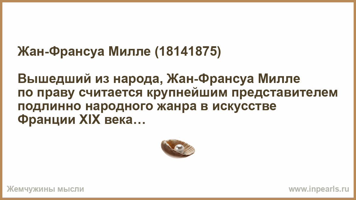 Вышедший из народа, Жан-Франсуа Милле по праву считается крупнейшим представителем подлинно народного жанра в искусстве Франции XIX века.