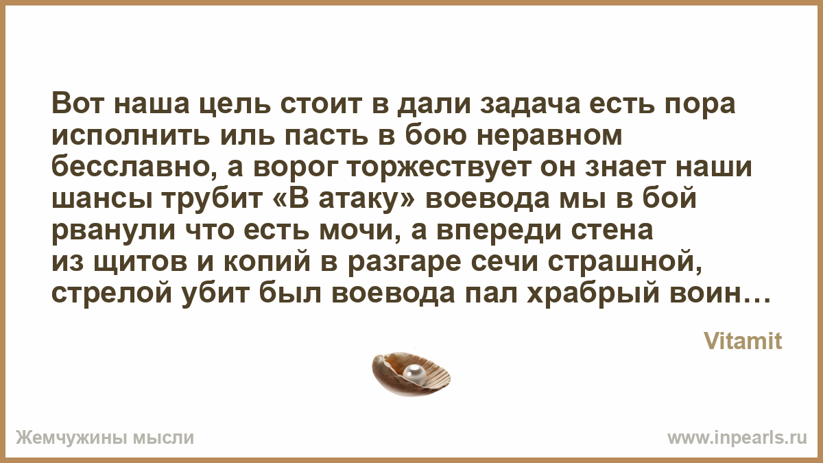 Вот наша цель стоит в дали задача есть пора исполнить иль пасть в бою неравном бесславно, а ворог торжествует он знает наши шансы трубит «В атаку» воевода мы в бой рванули что есть мочи, а впереди стена из щитов и копий в разгаре сечи страшной, стрелой убит был воевода пал храбрый воин, а вслед за ним и сын его погиб отважно защищая знамя не зря погибли наши люди пришла подмога вскоре разбили ворога, но славный воевода лежит со стрелой в груди и взгляд его направлен на знамя.