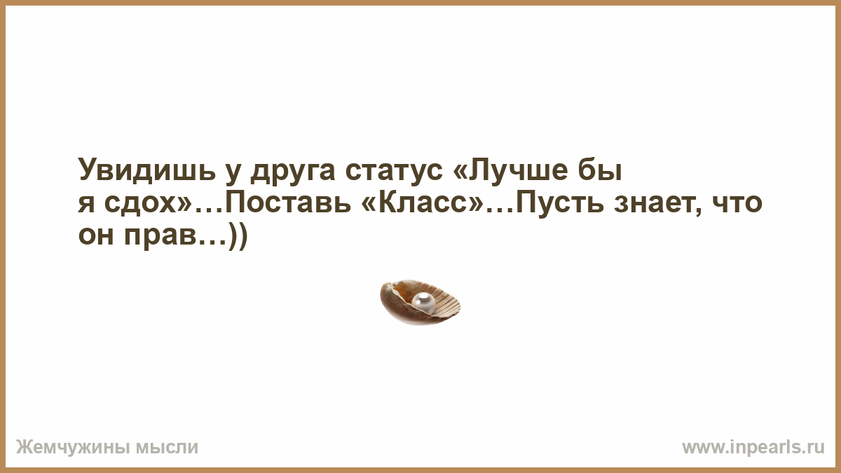 Увидишь у друга статус «Лучше бы я сдох»…Поставь «Класс»…Пусть знает, что он прав…))