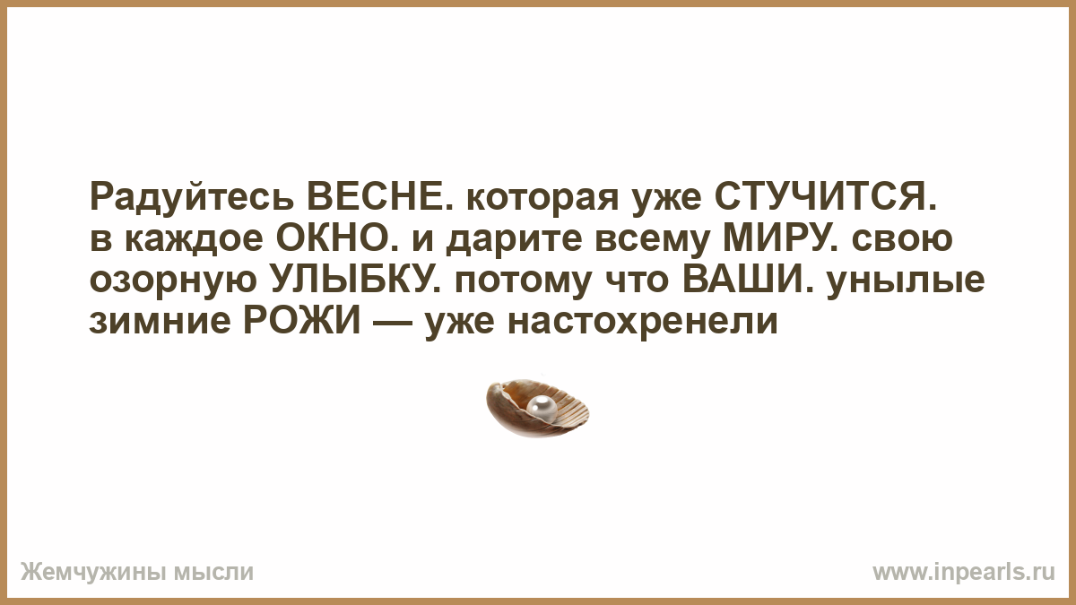 Радуйтесь ВЕСНЕ. которая уже СТУЧИТСЯ. в каждое ОКНО. и дарите всему МИРУ. свою озорную УЛЫБКУ. потому что ВАШИ. унылые зимние РОЖИ — уже настохренели