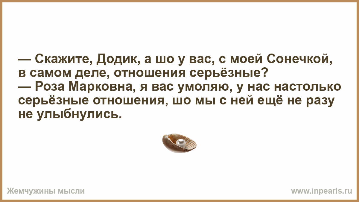 — Скажите, Додик, а шо у вас, с моей Сонечкой, в самом деле, отношения серьёзные? — Роза Марковна, я вас умоляю, у нас настолько серьёзные отношения, шо мы с ней ещё не разу не улыбнулись.