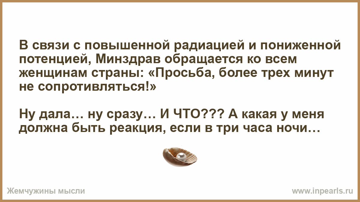 В связи с повышенной радиацией и пониженной потенцией, Минздрав обращается ко всем женщинам страны: «Просьба, более трех минут не сопротивляться!»