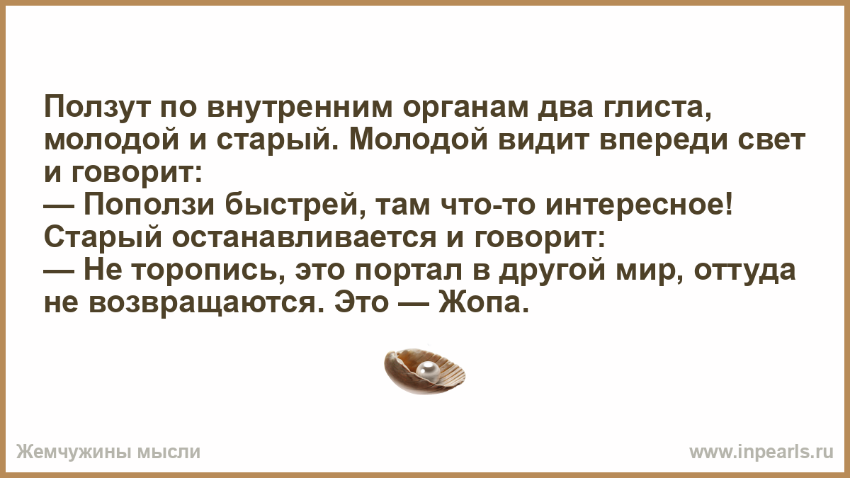 Ползут по внутренним органам два глиста, молодой и старый. Молодой видит впереди свет и говорит: — Поползи быстрей, там что-то интересное! Старый останавливается и говорит: — Не торопись, это портал в другой мир, оттуда не возвращаются. Это — Жопа.