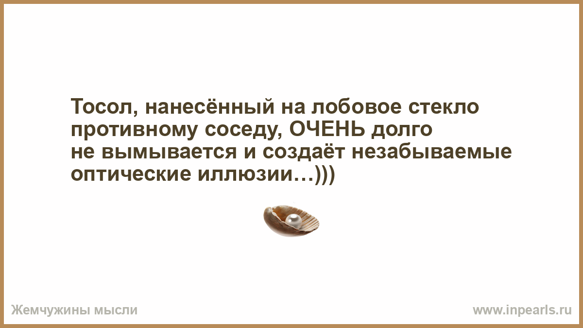 Тосол, нанесённый на лобовое стекло противному соседу, ОЧЕНЬ долго не вымывается и создаёт незабываемые оптические иллюзии…)))