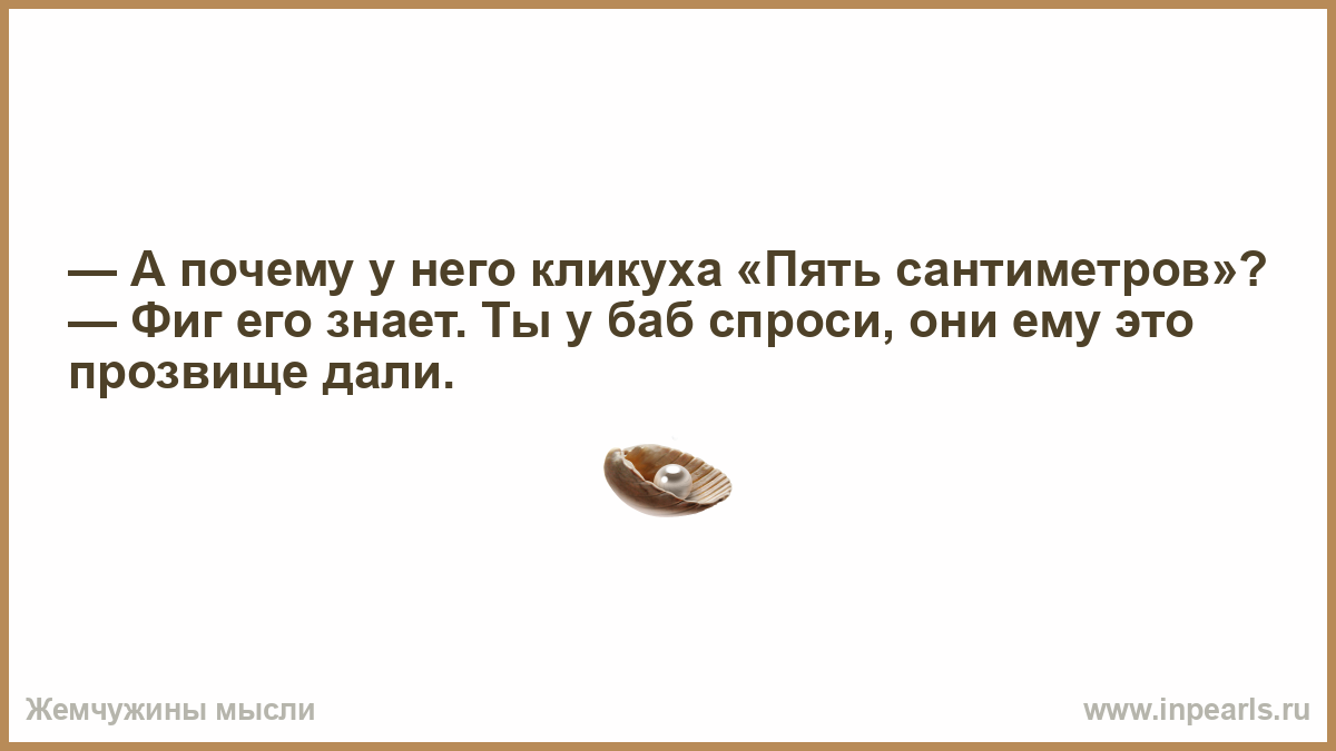 — А почему у него кликуха «Пять сантиметров»? — Фиг его знает. Ты у баб спроси, они ему это прозвище дали.
