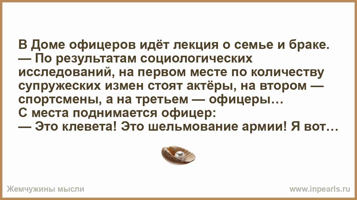 В Доме офицеров идёт лекция о семье и браке. — По результатам социологических исследований, на первом месте по количеству супружеских измен стоят актёры, на втором — спортсмены, а на третьем — офицеры… С места поднимается офицер: — Это клевета! Это шельмование армии! Я вот женат сорок лет, и за эти сорок лет ни разу жене не изменил. Генерал из президиума: — Вот из-за таких раздолбаев мы и плетёмся на третьем месте.
