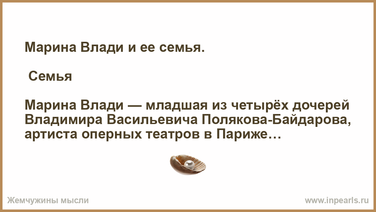 Марина Влади (настоящее имя Екатерина Марина Полякова-Байдарова) появилась на свет 10 мая 1938 года в городке Клиши-ла-Гаренн, Франция. Ее родители были русскими, но в начале ХХ века вместе со своими семьями эмигрировали в Европу.
