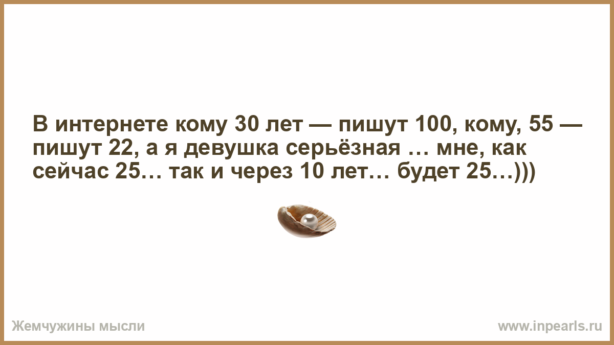В интернете кому 30 лет — пишут 100, кому, 55 — пишут 22, а я девушка серьёзная … мне, как сейчас 25… так и через 10 лет… будет 25…)))