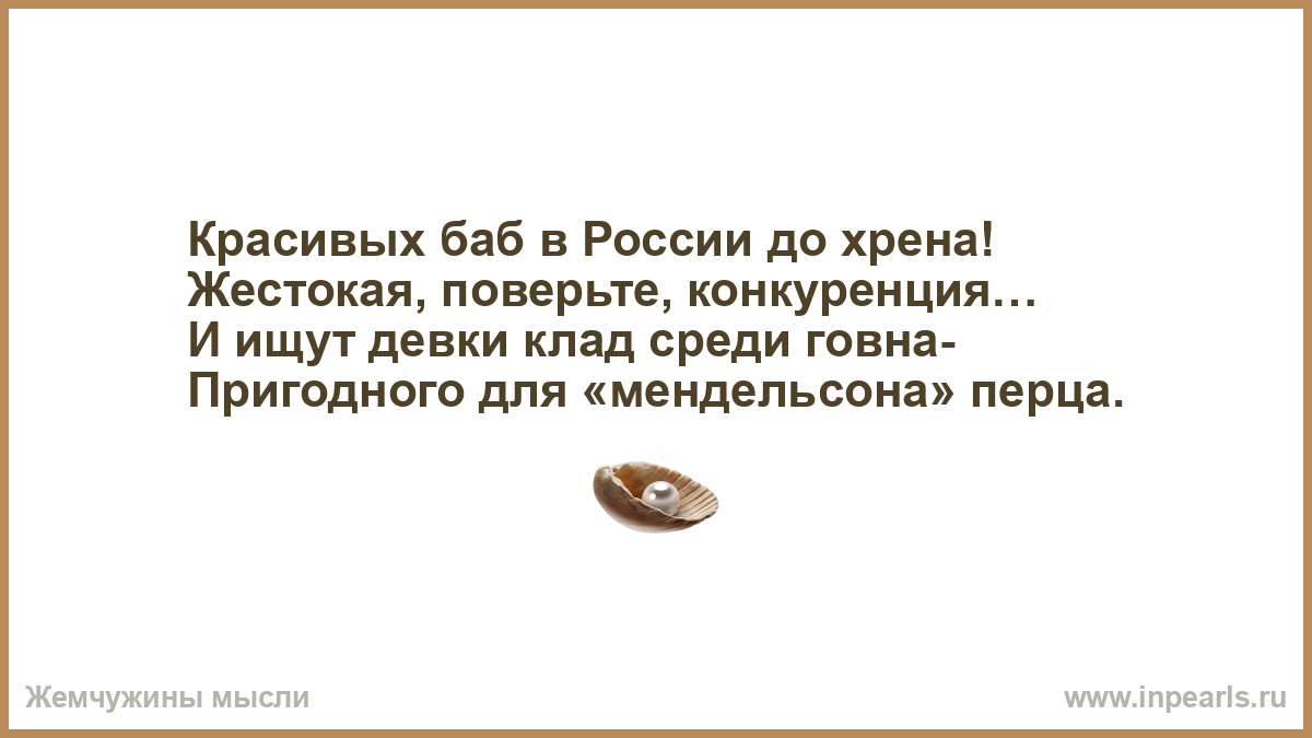 Красивых баб в России до хрена! Жестокая, поверьте, конкуренция… И ищут девки клад среди говна- Пригодного для «мендельсона» перца.