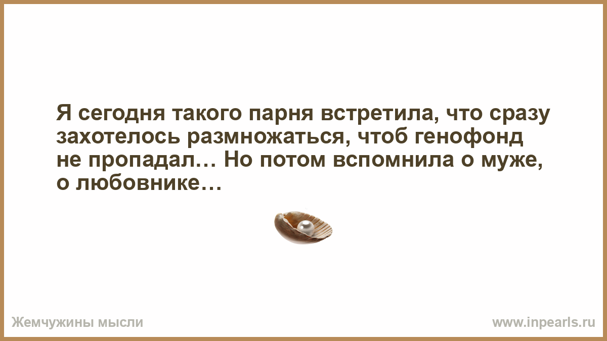 Я сегодня такого парня встретила, что сразу захотелось размножаться, чтоб генофонд не пропадал… Но потом вспомнила о муже, о любовнике…