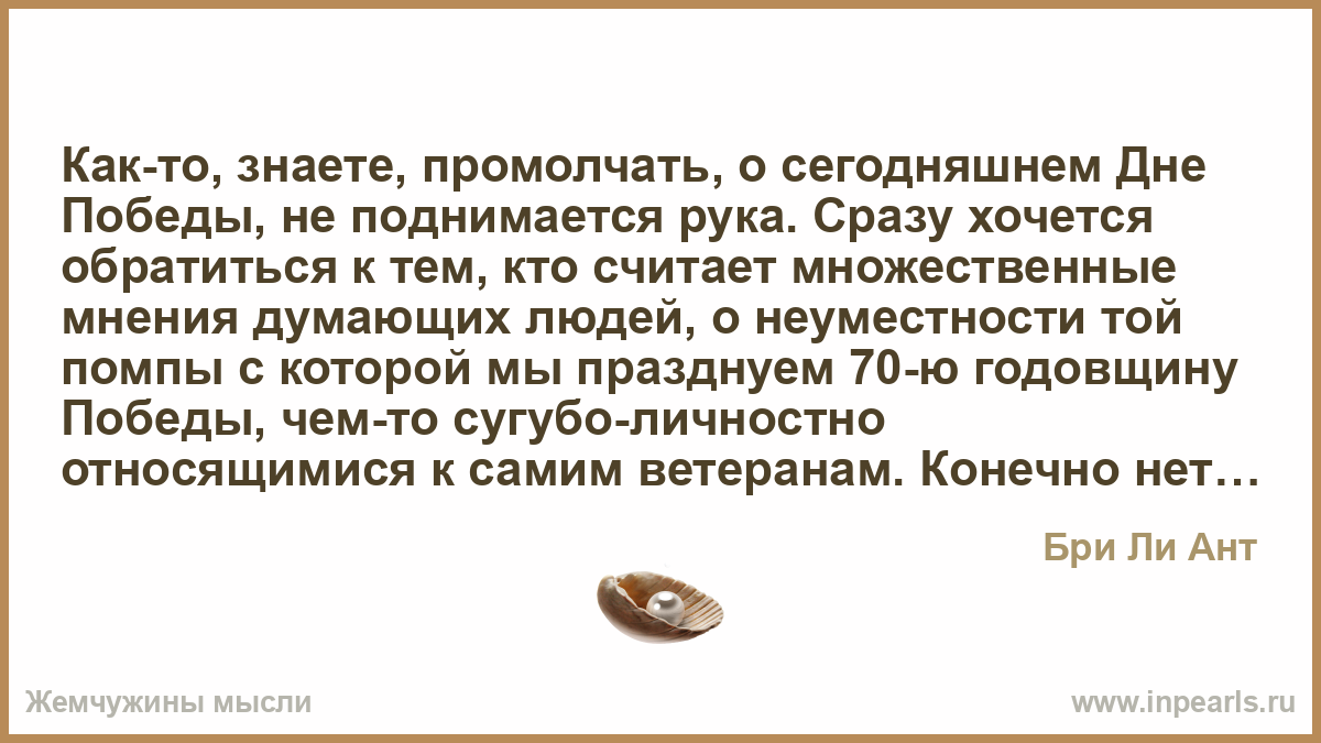 Как-то, знаете, промолчать, о сегодняшнем Дне Победы, не поднимается рука. Сразу хочется обратиться к тем, кто считает множественные мнения думающих людей, о неуместности той помпы с которой мы празднуем 70-ю годовщину Победы, чем-то сугубо-личностно относящимися к самим ветеранам. Конечно нет. Глупо думать, что те, кто считает что ветеранов надо любить всегда, а не только по праздникам, ненавидят ветеранов или имеют, именно к ним, какие-либо претензии. У всех у нас воевали родственники, никто из нас не любит фашизм. Речь, скорее, о подмене понятий, настоящие: любовь, забота, патриотизм и их искусственные заменители (не люблю слова — симулякры). Но, чтобы было сразу понятно о чём, собственно, речь, надо сделать некоторое отступление, так сказать, чтобы оказаться у начала — надо начать издалека.