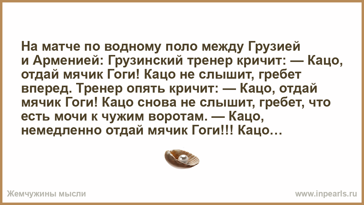 На матче по водному поло между Грузией и Арменией: Грузинский тренер кричит: — Кацо, отдай мячик Гоги! Кацо не слышит, гребет вперед. Тренер опять кричит: — Кацо, отдай мячик Гоги! Кацо снова не слышит, гребет, что есть мочи к чужим воротам. — Кацо, немедленно отдай мячик Гоги!!! Кацо подплывает к воротам соперника, бросает и забивает гол. Довольный, вылезает из бассейна и подходит к тренеру. Тренер в гневе говорит: — Кацо, я же тебе говорил отдать мячик Гоги! — Ну я же гол забил. — Гол-то ты забил, а Гоги утонул.