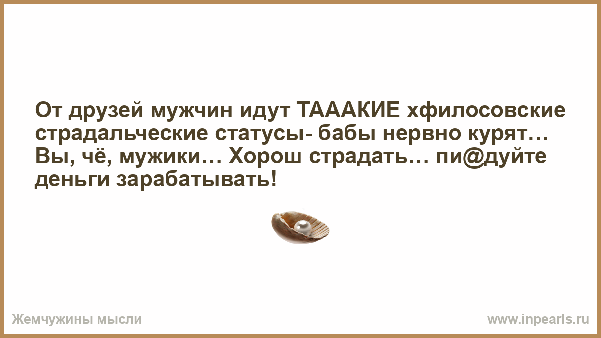 От друзей мужчин идут ТАААКИЕ хфилосовские страдальческие статусы- бабы нервно курят… Вы, чё, мужики… Хорош страдать… пи@дуйте деньги зарабатывать!