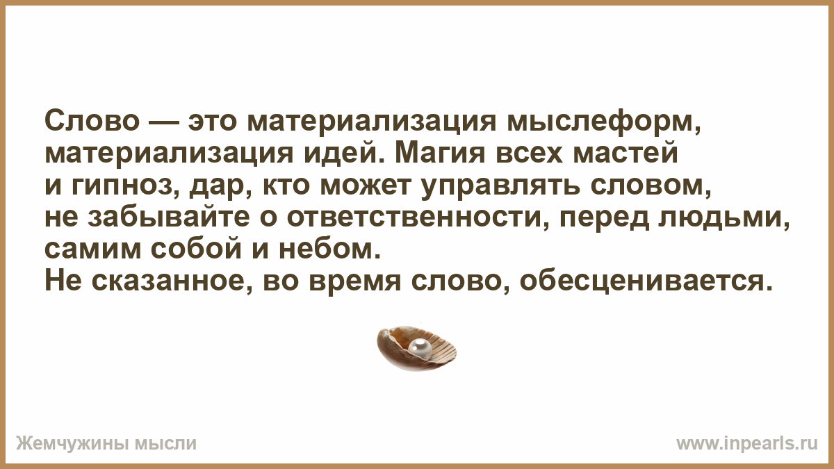 Слово — это материализация мыслеформ, материализация идей. Магия всех мастей и гипноз, дар, кто может управлять словом, не забывайте о ответственности, перед людьми, самим собой и небом.