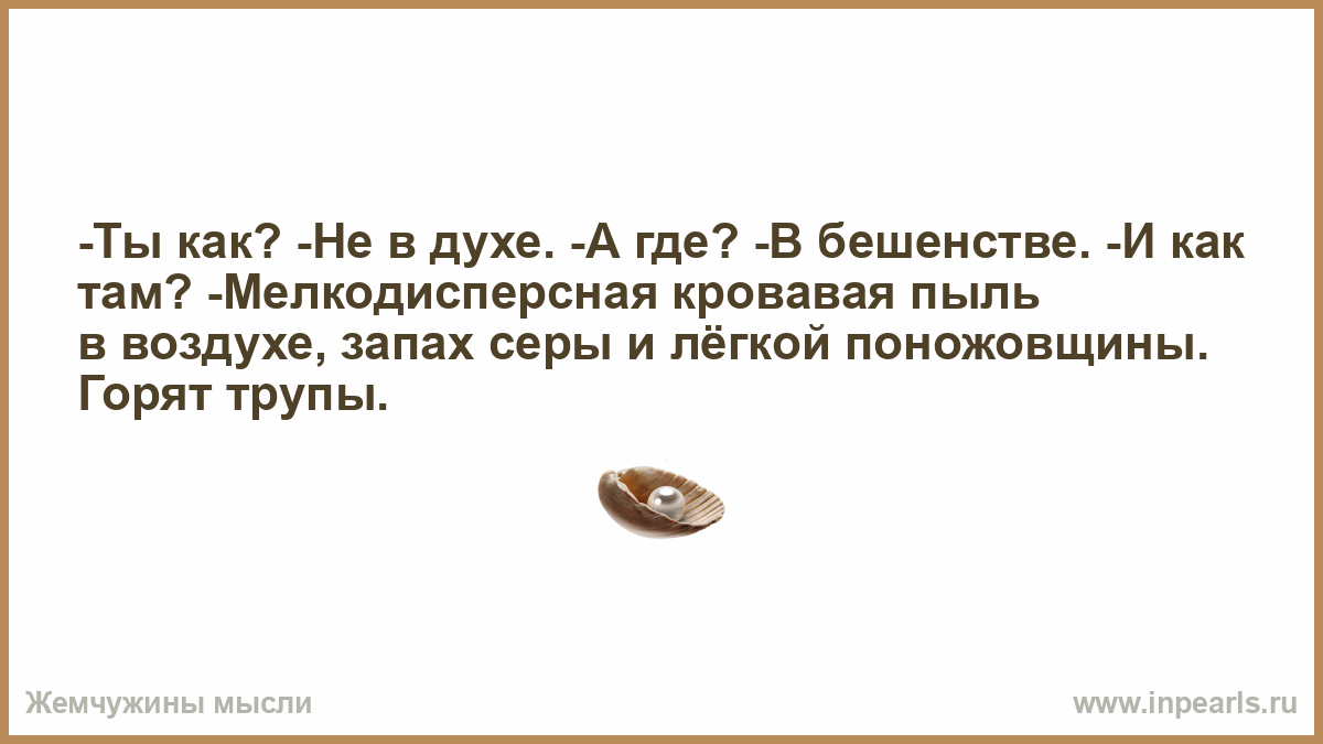 -Ты как? -Не в духе. -А где? -В бешенстве. -И как там? -Мелкодисперсная кровавая пыль в воздухе, запах серы и лёгкой поножовщины. Горят трупы.