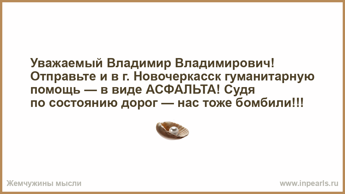Уважаемый Владимир Владимирович! Отправьте и в г. Новочеркасск гуманитарную помощь — в виде АСФАЛЬТА! Судя по состоянию дорог — нас тоже бомбили!!!