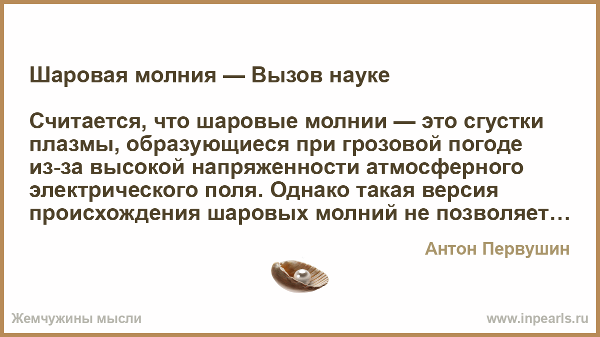 Считается, что шаровые молнии — это сгустки плазмы, образующиеся при грозовой погоде из-за высокой напряженности атмосферного электрического поля. Однако такая версия происхождения шаровых молний не позволяет объяснить неожиданные и порой весьма пугающие эффекты, которыми сопровождается почти каждое их появление.