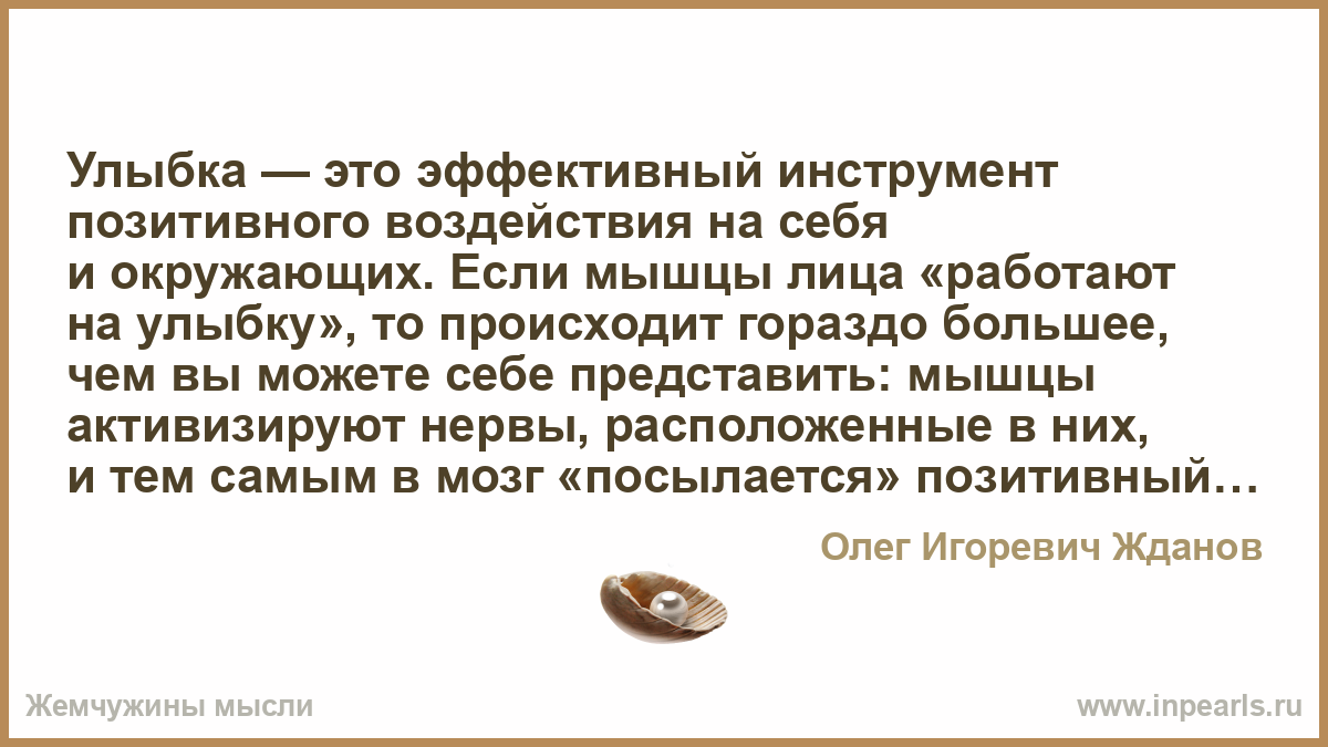 Улыбка — это эффективный инструмент позитивного воздействия на себя и окружающих. Если мышцы лица «работают на улыбку», то происходит гораздо большее, чем вы можете себе представить: мышцы активизируют нервы, расположенные в них, и тем самым в мозг «посылается» позитивный сигнал. Вы можете это проверить прямо сейчас. Улыбнитесь (неважно, если получится гримаса, вся суть в том, что работают нужные мышцы). Сохраняйте это положение примерно 30 секунд. Если вы честно проделаете этот эксперимент, то сможете однозначно констатировать: что-то все же «происходит». Было бы хорошо, если бы вы описали ваши впечатления, не откладывая.