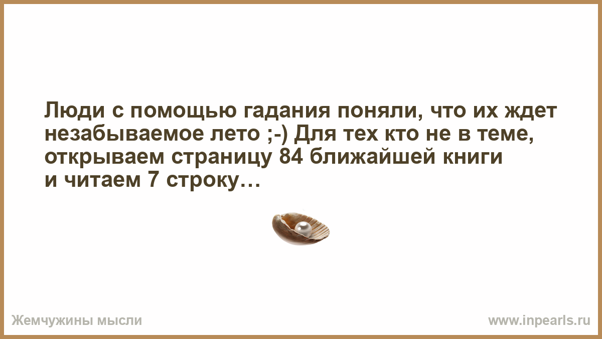 Люди с помощью гадания поняли, что их ждет незабываемое лето ;-) Для тех кто не в теме, открываем страницу 84 ближайшей книги и читаем 7 строку…