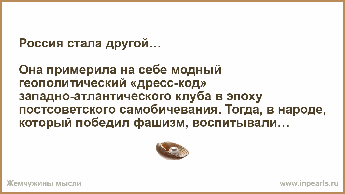 Она примерила на себе модный геополитический «дресс-код» западно-атлантического клуба в эпоху постсоветского самобичевания. Тогда, в народе, который победил фашизм, воспитывали комплекс неполноценности. Но Россия решила, что это ей — не подходит!