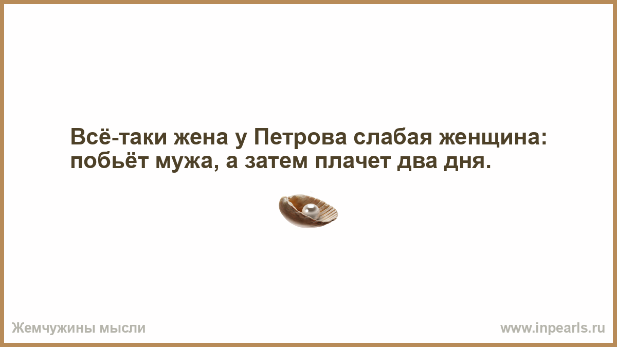 Всё-таки жена у Петрова слабая женщина: побьёт мужа, а затем плачет два дня.