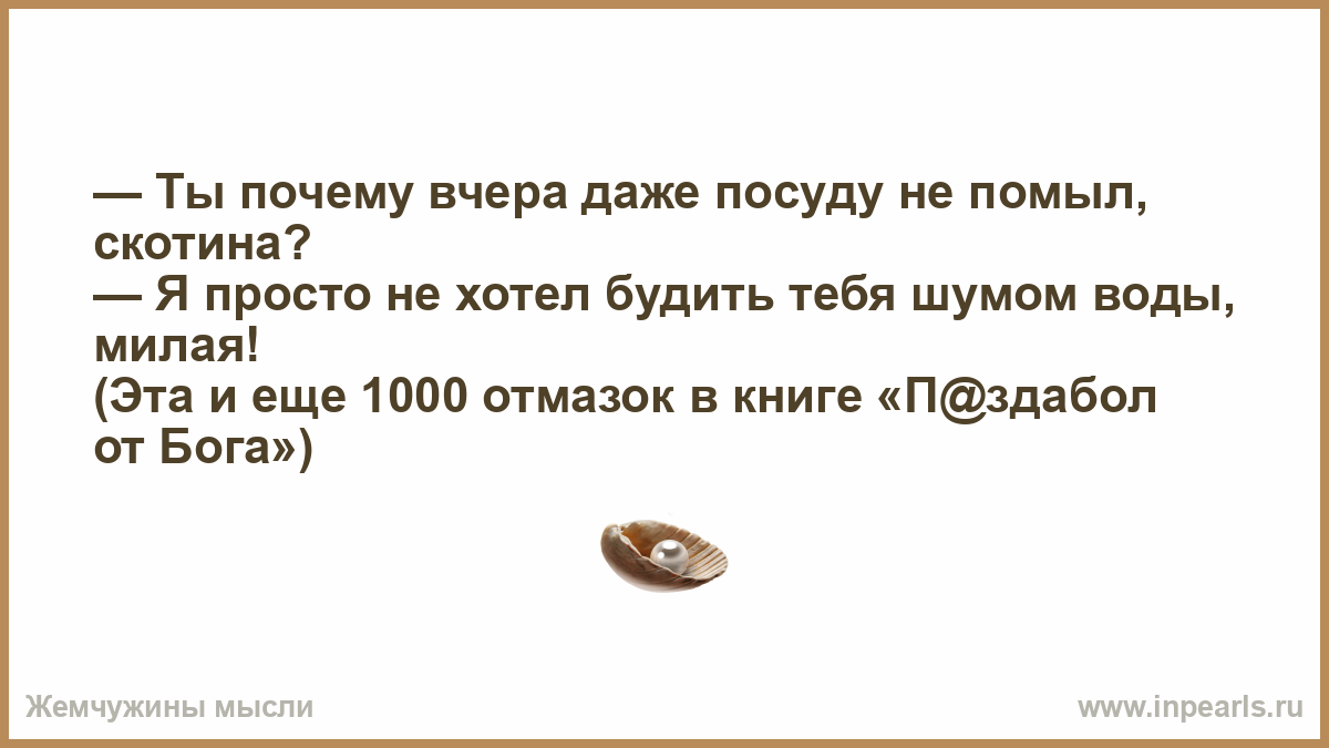 — Ты почему вчера даже посуду не помыл, скотина? — Я просто не хотел будить тебя шумом воды, милая! (Эта и еще 1000 отмазок в книге «П@здабол от Бога»)