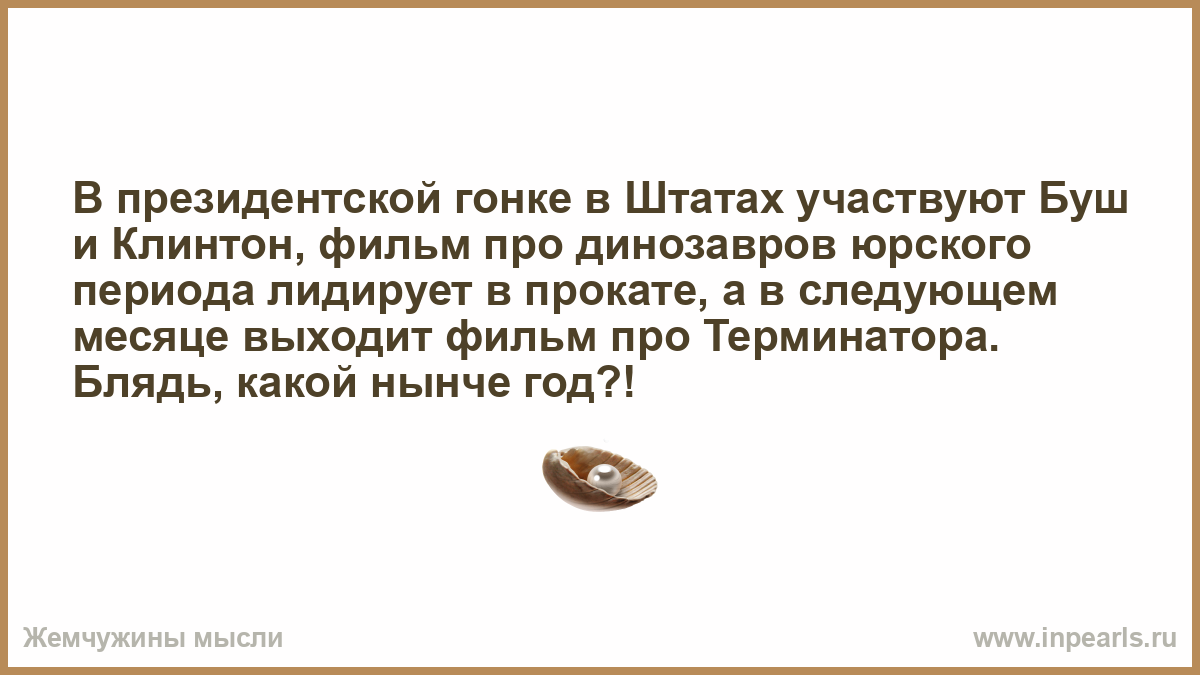 В президентской гонке в Штатах участвуют Буш и Клинтон, фильм про динозавров юрского периода лидирует в прокате, а в следующем месяце выходит фильм про Терминатора. Блядь, какой нынче год?!