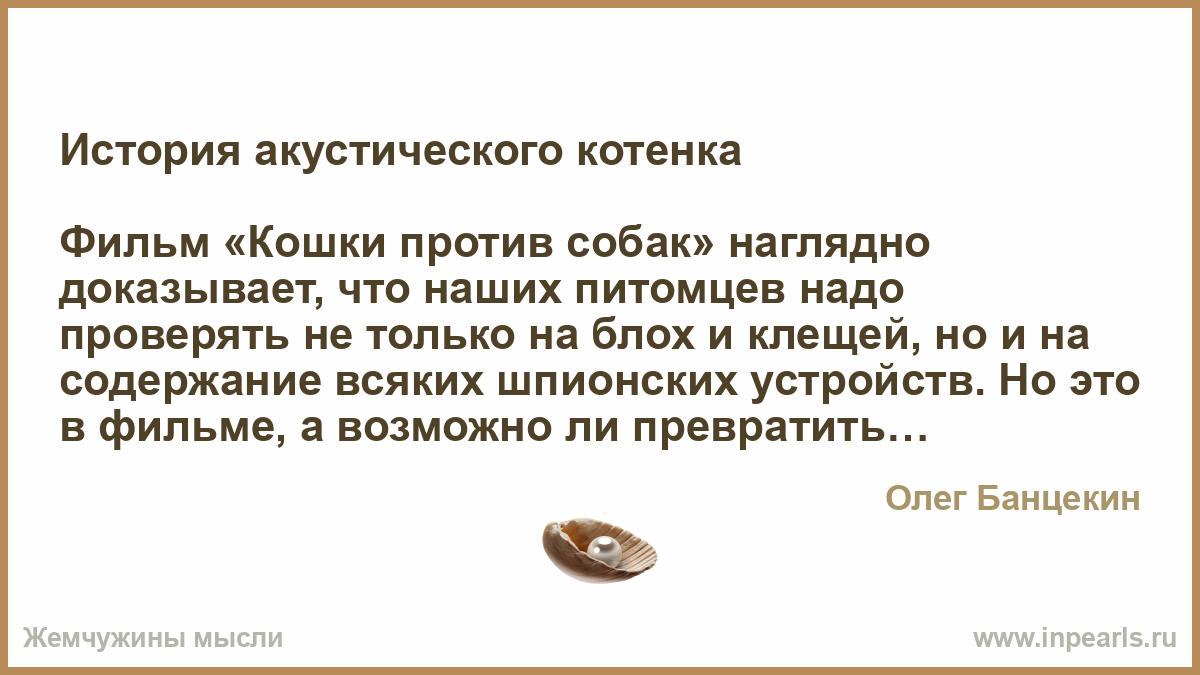 По случайному совпадению в год, когда проект «Акустический котенок» закончился провалом, на экраны вышел британский фильм «Шпион с холодным носом», где главную роль играл пес, «оборудованный» для слежки за «империей зла» (это опять же СССР, если кто не в курсе). Все-таки иногда стоит оставлять художественный вымысел по ту сторону экрана