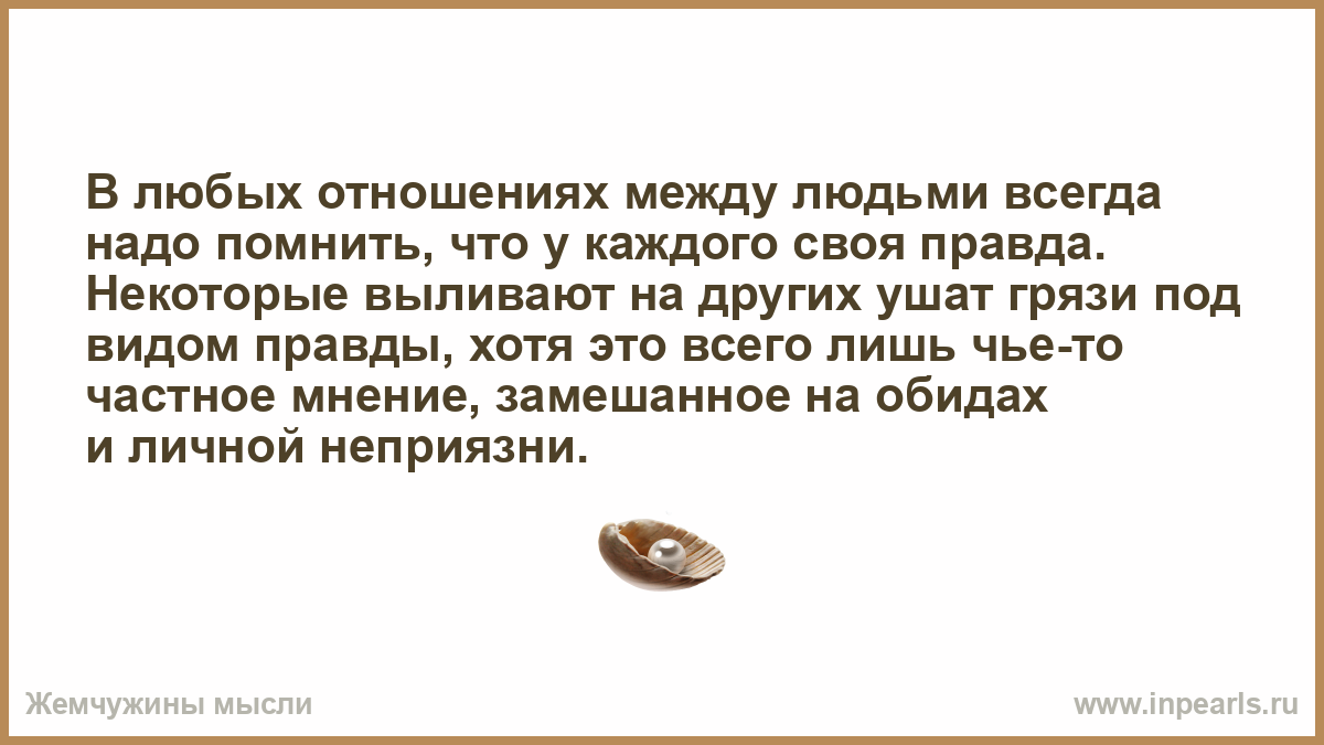В любых отношениях между людьми всегда надо помнить, что у каждого своя правда. Некоторые выливают на других ушат грязи под видом правды, хотя это всего лишь чье-то частное мнение, замешанное на обидах и личной неприязни.