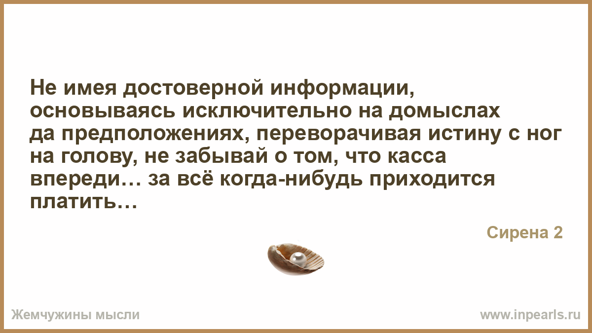 Не имея достоверной информации, основываясь исключительно на домыслах да предположениях, переворачивая истину с ног на голову, не забывай о том, что касса впереди… за всё когда-нибудь приходится платить…