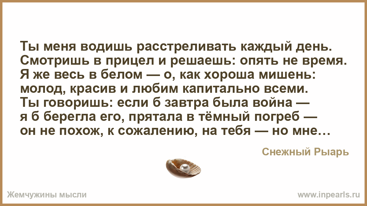 Ты меня водишь расстреливать каждый день в маленький тир твоего дорогого сердца. Падает в травы моя золотая тень, Сольвейг поёт и соната уходит в скерцо.