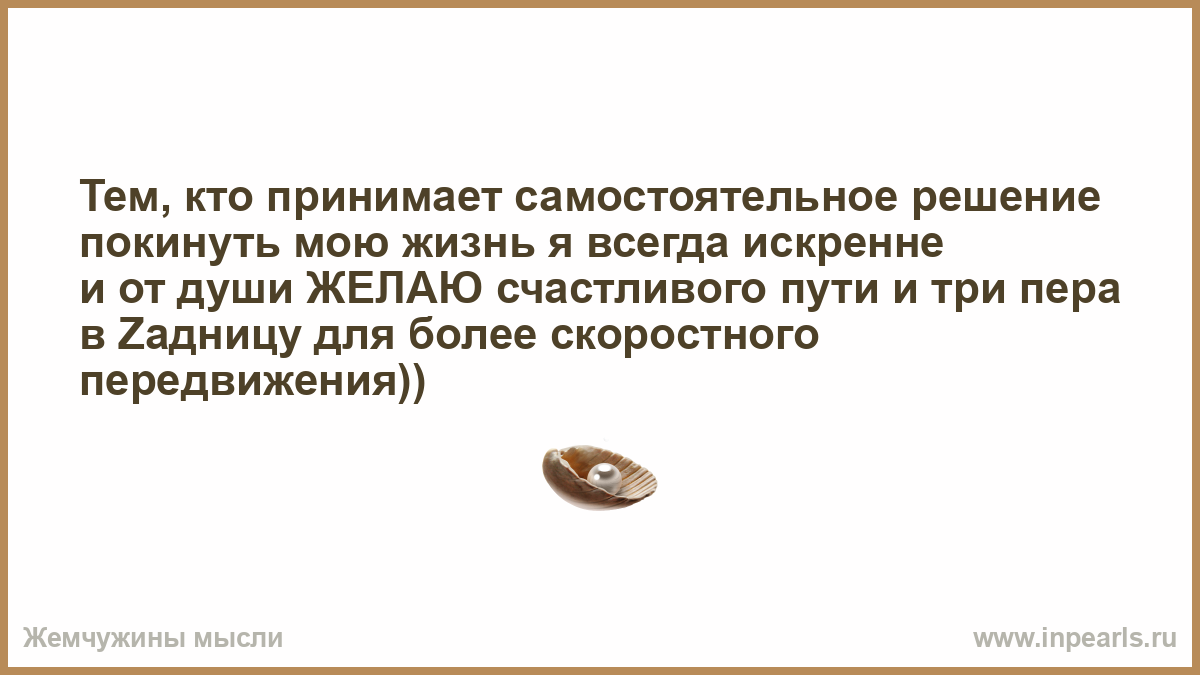 Тем, кто принимает самостоятельное решение покинуть мою жизнь я всегда искренне и от души ЖЕЛАЮ счастливого пути и три пера в Zадницу для более скоростного передвижения))