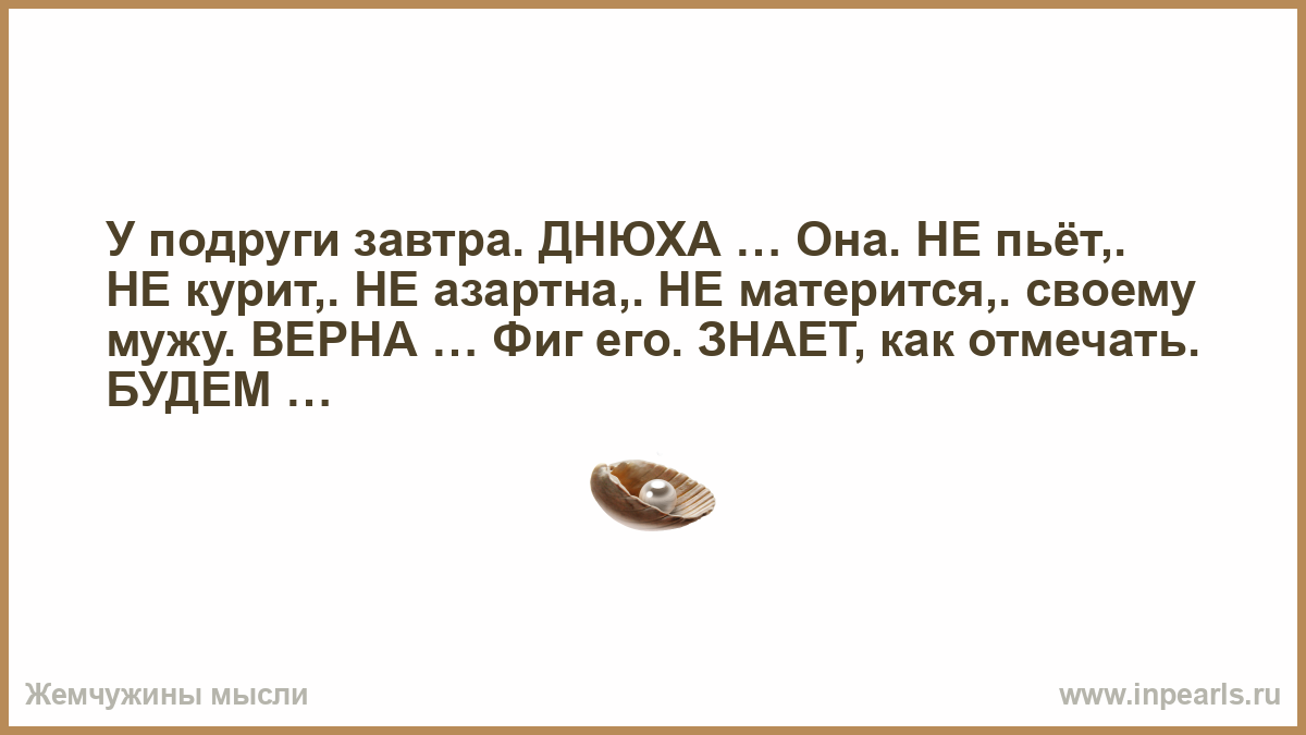 У подруги завтра. ДНЮХА … Она. НЕ пьёт,. НЕ курит,. НЕ азартна,. НЕ матерится,. своему мужу. ВЕРНА … Фиг его. ЗНАЕТ, как отмечать. БУДЕМ …