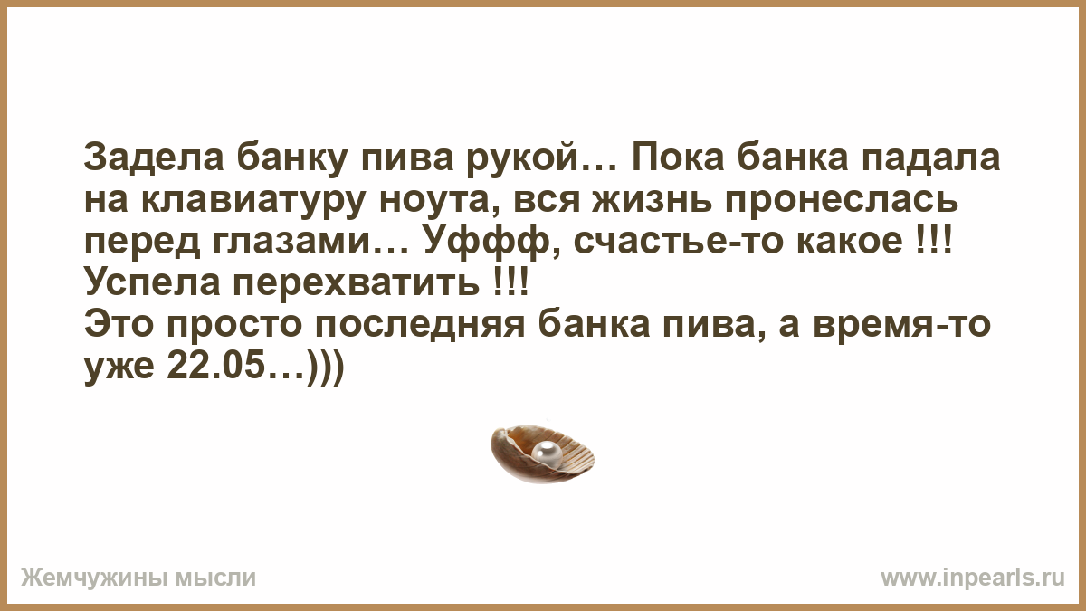 Задела банку пива рукой… Пока банка падала на клавиатуру ноута, вся жизнь пронеслась перед глазами… Уффф, счастье-то какое !!! Успела перехватить !!! Это просто последняя банка пива, а время-то уже 22.05…)))