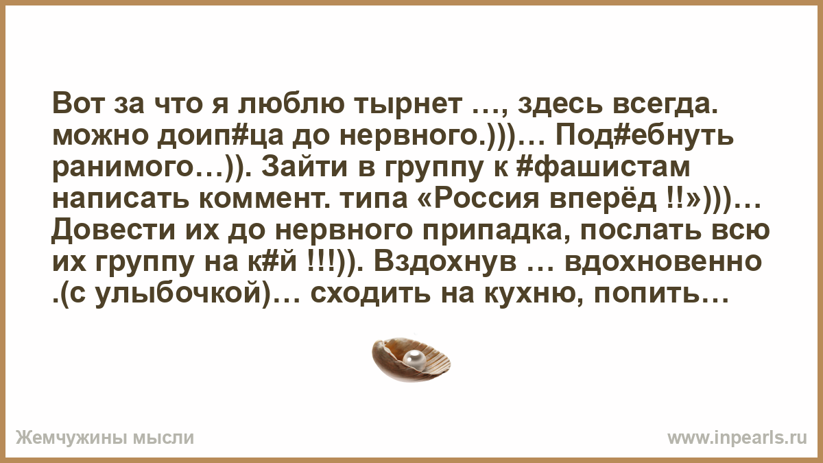 Вот за что я люблю тырнет …, здесь всегда. можно доип#ца до нервного.)))… Под#ебнуть ранимого…)). Зайти в группу к #фашистам написать коммент. типа «Россия вперёд !!»)))… Довести их до нервного припадка, послать всю их группу на к#й !!!)). Вздохнув … вдохновенно .(с улыбочкой)… сходить на кухню, попить. молочка … и баиньки.))ах)))