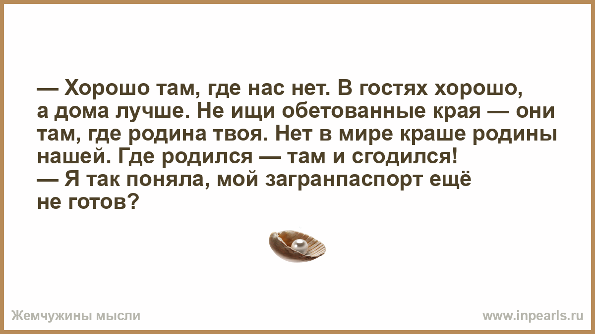 — Хорошо там, где нас нет. В гостях хорошо, а дома лучше. Не ищи обетованные края — они там, где родина твоя. Нет в мире краше родины нашей. Где родился — там и сгодился! — Я так поняла, мой загранпаспорт ещё не готов?